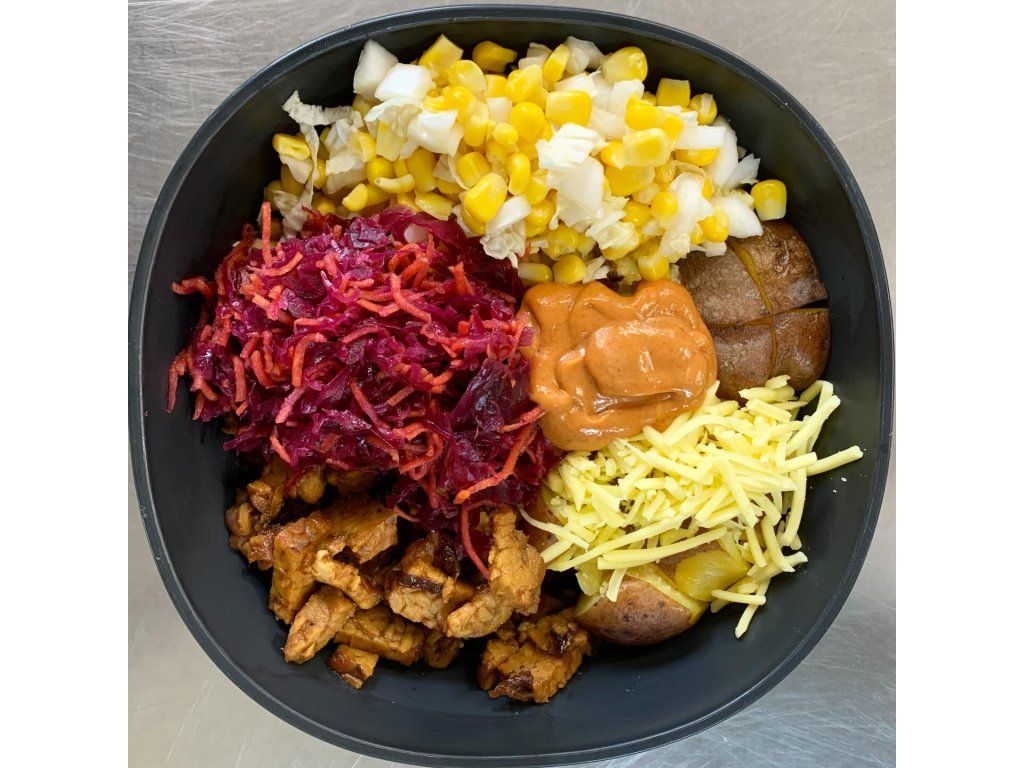 čtvrtek 23. 4. - Baked potato bowl - pečená brambora ve slupce, tempehová slanina, BBQ dip, kukuřička a vegan sýr a salát pickels z červeného zelí